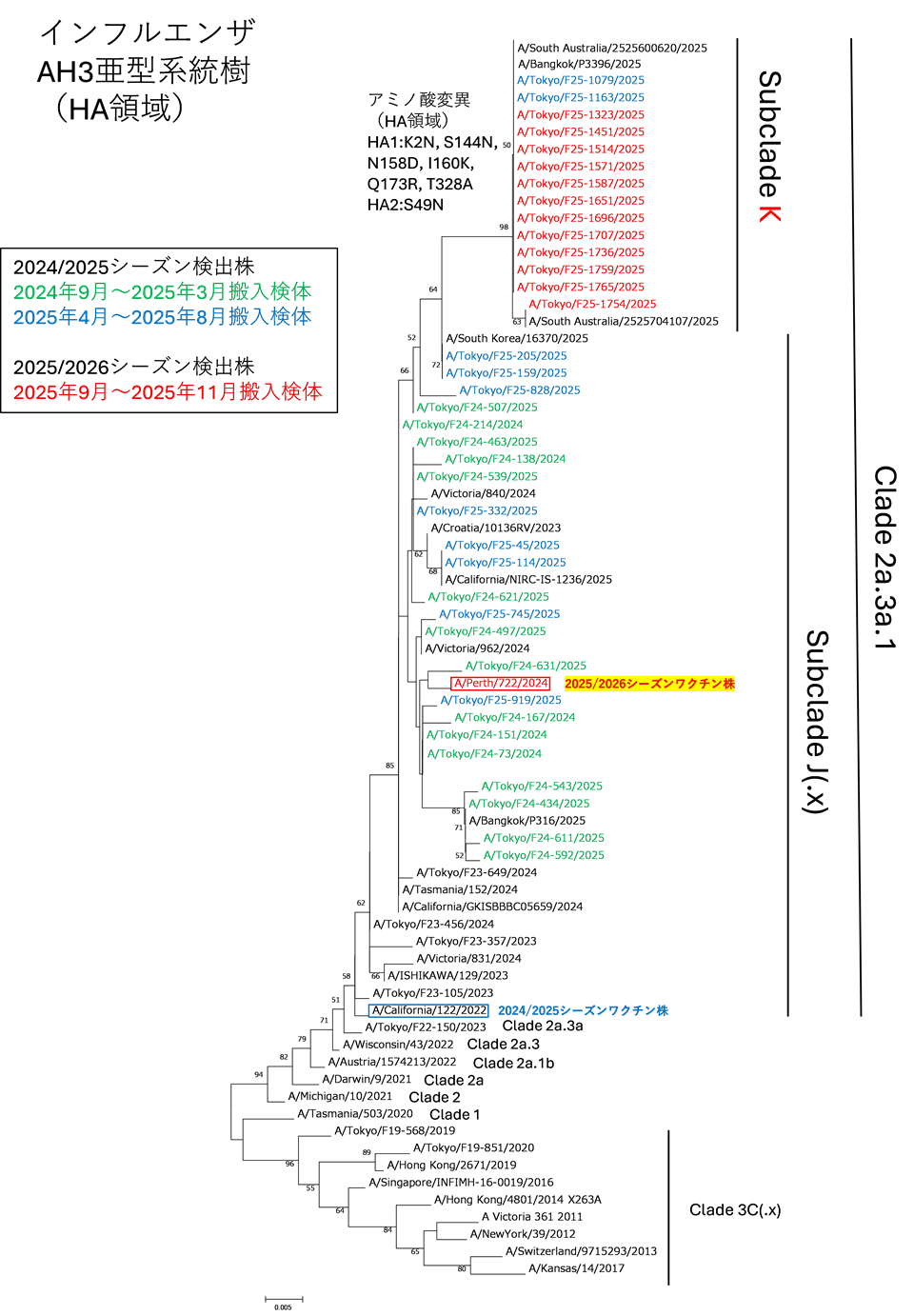 東京都におけるAH3亜型インフルエンザウイルスのHA遺伝子系統樹(2025-26年シーズン)